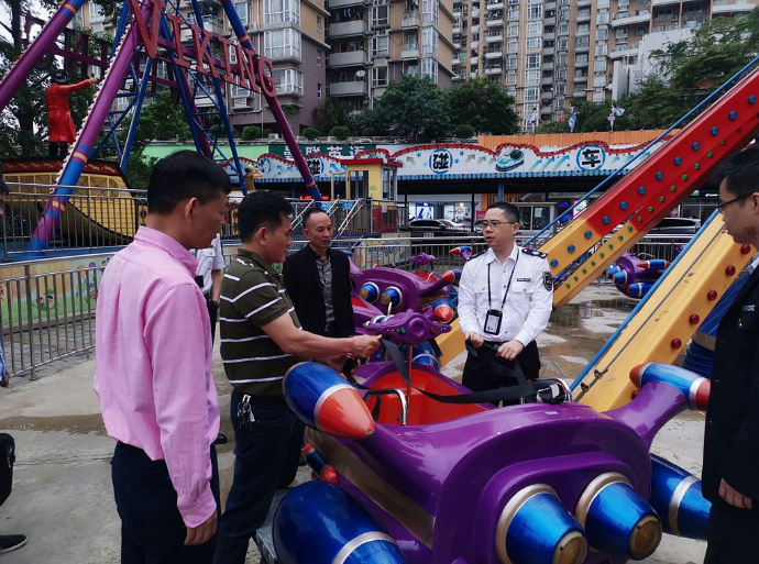 执法人员对各经营单位对户外大型游乐设施的安全管理制度落实情况,安全操作规程以及安全生产岗位责任层层落实情况进行了督查,并对设备定期检验、操作人员持证上岗以及经营单位对设备日常运营的自查自检情况进行了详细检查。