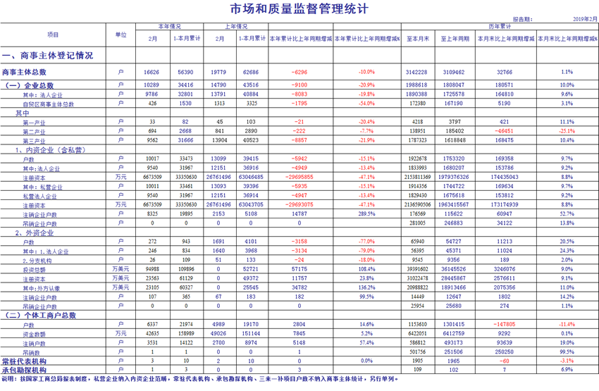 2019年2月份商事主体统计报表