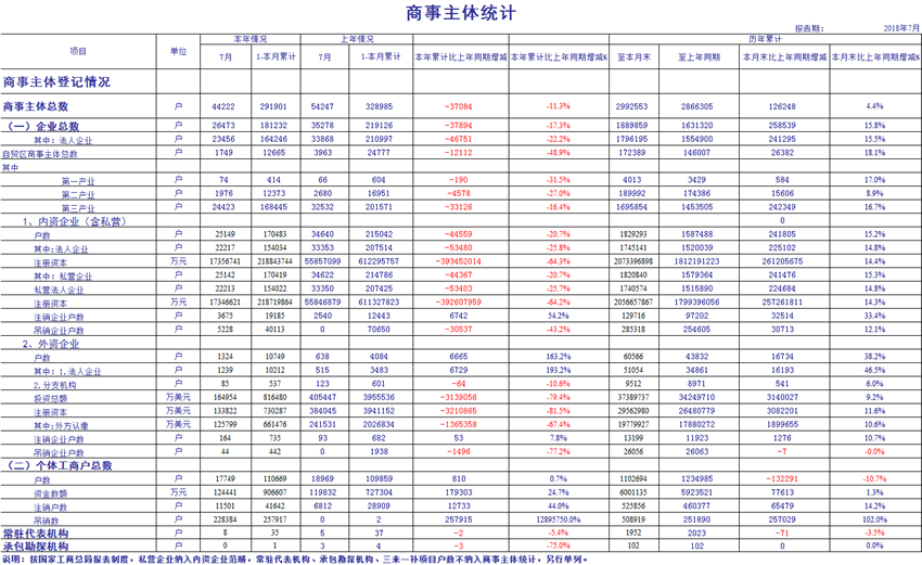 2018年7月份商事主体统计报表