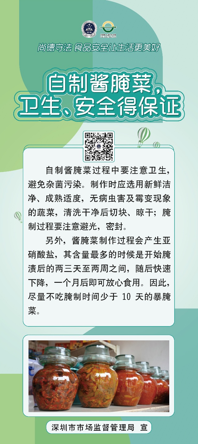 自制酱腌菜过程中要注意卫生,避免杂菌污染。制作时应选用新鲜洁净、成熟适度,无病虫害及霉变现象的蔬菜,清洗干净后切块、晾干;腌制过程要注意避光,密封。