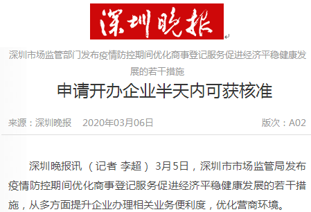 3月5日,深圳市市场监管局发布疫情防控期间优化商事登记服务促进经济平稳健康发展的若干措施,从多方面提升企业办理相关业务便利度,优化营商环境。